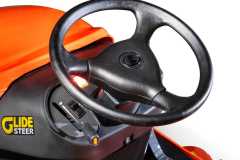 Już jedno spojrzenie pod spód kosiarki udowadnia, że mamy do czynienia z urządzeniem profesjonalnym. Świadczy o tym zastosowanie wałka przegubowego do napędu decka tnącego (zamiast pasków klinowych powszechnie stosowanych w klasie maszyn amatorskich). Wytrzymały, hydrostatyczny napęd zwiększa wygodę długotrwałej pracy operatora. Brak sprzęgła i zmiana kierunku poruszania się poprzez naciśnięcie odpowiedniej strony pedału jazdy sprawiają, że sterowanie maszyną jest niezwykle proste i komfortowe. Łatwość prowadzenia dodatkowo zwiększa seryjne wspomaganie kierownicy oraz stały napęd 4x4, dzięki czemu kosiarka idealnie spisuje się na wzniesieniach. Co więcej, model GR2120 zaopatrzono w funkcję odłączania napędu wewnętrznego, tylnego koła przy maksymalnym skręcie kosiarki dla zacieśnienia nawrotu.